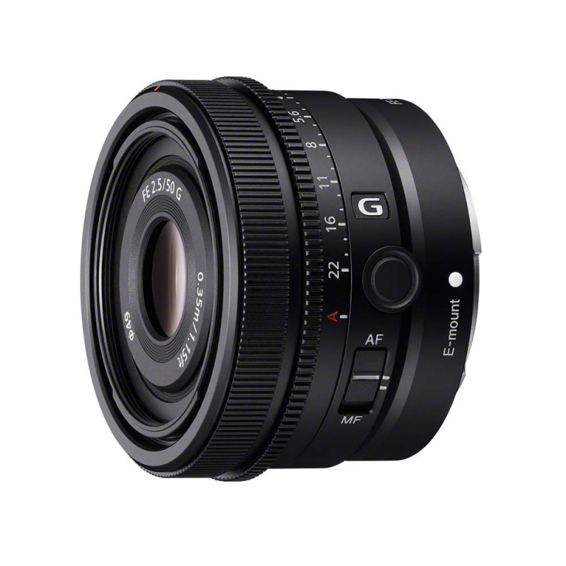 Ce nouvel objectif SONY FE 50 mm f/2,5 G offre l’excellente qualité d’image et le magnifique bokeh d’un objectif Sony G dans un format compact de qualité pour une utilisation intuitive. Il s’agit de l’objectif idéal pour prendre des portraits décontractés. La mise au point automatique rapide, précise et silencieuse est idéale pour les photos comme pour les vidéos et permet de capturer les moments cruciaux. La conception mécanique de cette optique Sony 50/2.5 G tire le meilleur parti d’une optique de pointe avec une disposition efficace des 2 lentilles asphériques, ainsi qu’un faible tirage optique propre aux appareils photo hybrides. Le résultat ? Un format compact et un poids de seulement 174 g. C’est l’objectif idéal pour le portrait ou les instantanés en extérieur comme pour filmer avec un gimbal. La distance de mise au point minimale et l’agrandissement de respectivement 35 cm/0,18× (mise au point automatique) et 31 cm/0,21× (mise au point manuelle) rendent cet objectif adapté à de nombreuses situations, comme les images de produits ou macro, au fond flou faisant ressortir le sujet. Il est doté d’une conception optique avancée incluant deux éléments asphériques et un verre ED (Dispersion extra-faible) pour une résolution incroyablement élevée sur toute l’image, ainsi qu’un magnifique flou d’arrière-plan (bokeh). Deux moteurs linéaires doubles assurent une mise au point automatique rapide et précise, avec d’excellentes performances de suivi.
